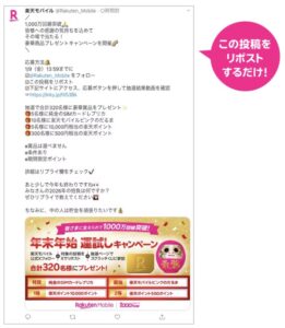 楽天モバイル公式Xアカウントの「1,000万回線突破 ! 年末年始 運試しキャンペーン」の投稿を、ご自身のXにリポストしてください。