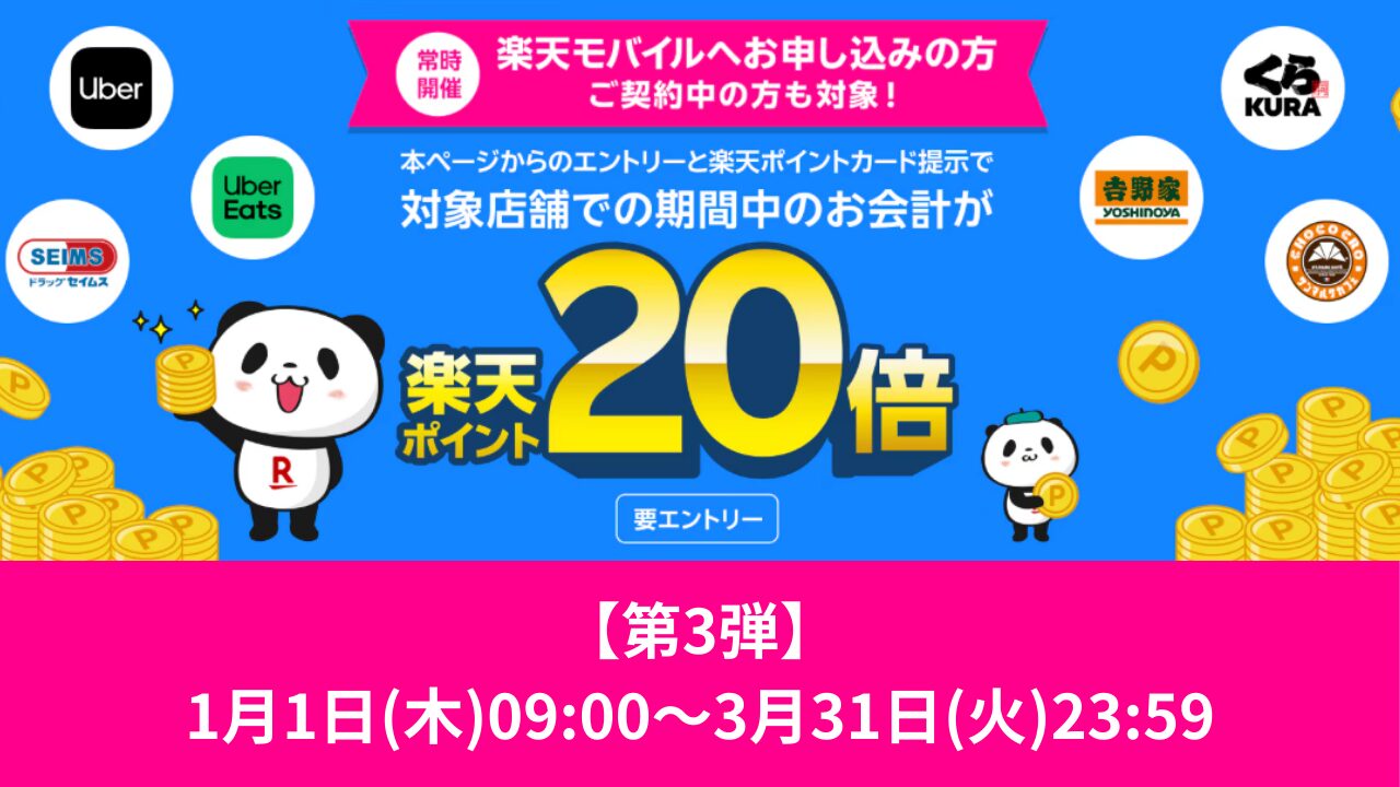 楽天モバイルでは、契約者を対象として「対象店舗でのお会計でポイント20倍」キャンペーンを開催しています。このキャンペーンは、日常の買い物でポイント還元が大幅にアップするお得なキャンペーンで、街のコンビニや飲食店、ドラッグストアなど幅広い店舗で利用できます。