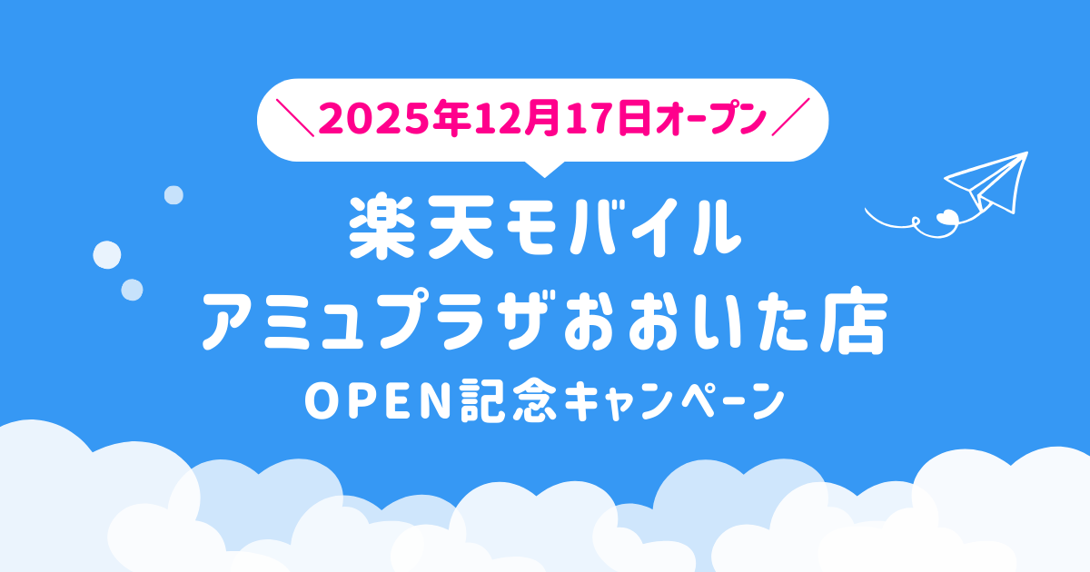 2025年12月17日(水)、大分県大分市要町に新たに「楽天モバイル アミュプラザおおいた店」がオープン。楽天モバイルの新規店舗では、開店から60日間限定のOPEN記念キャンペーンを実施しています。