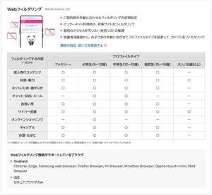 カテゴリ別の「Webフィルタリング」機能で、年齢に合わせてお子さまのインターネット利用を見守ります。特定のドメインやURLごとのブロック設定も可能です。
