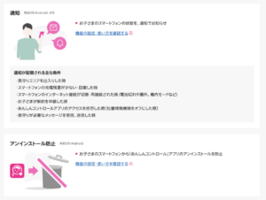 スマートフォンの充電残量が少ない・回復した時や、スマートフォンのインターネット接続が切断・再接続された時など、お子さまのスマートフォンの状態を、通知でお知らせします。