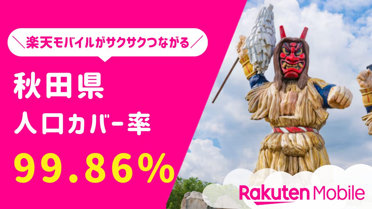 楽天モバイルの秋田県(男鹿市含む)での人口カバー率はなんと99.86%で安定したデータ通信・通話が可能です。人口カバー率の高さや通信品質の評価から見ても、男鹿市は楽天モバイルがつながりやすいエリアと言えるでしょう。