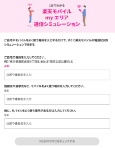 楽天モバイルが提供するmyエリア通信シミュレーションでは、自宅やよく行く場所の住所を入力することで、すぐに楽天モバイルの電波状況をシミュレーションできます。