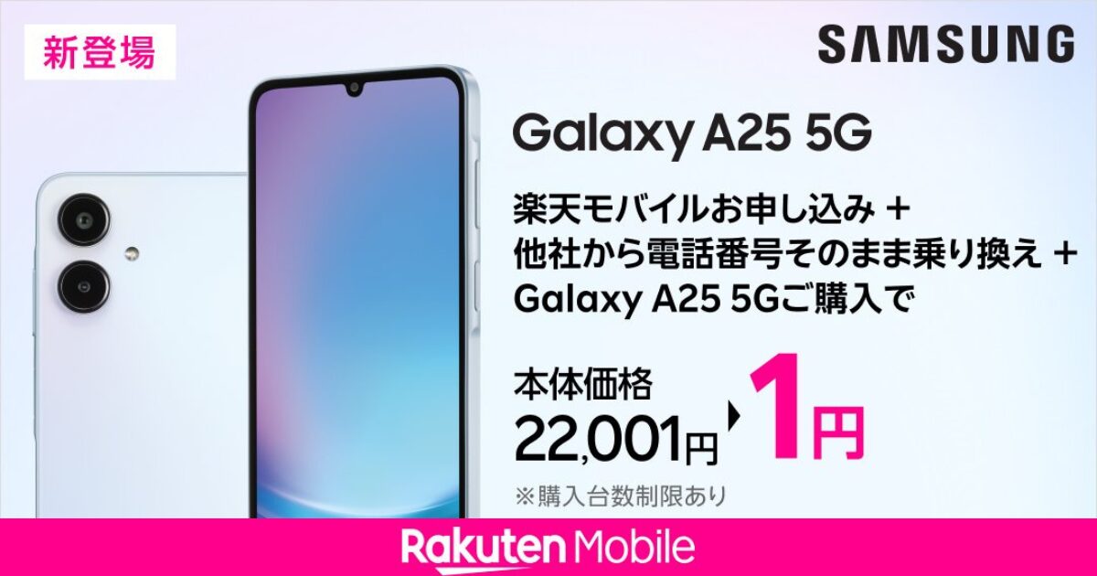 楽天モバイルは、Galaxy A25 5Gを11月20日(木)から発売開始しました。他社からの乗り換え(MNP)で「Rakuten最強プラン」または「Rakuten最強U‑NEXT」契約と同時に本体を購入すると、定価22,001円(税込)から22,000円を割引、1円で購入可能となります。(2年後に返却する必要もありません。)