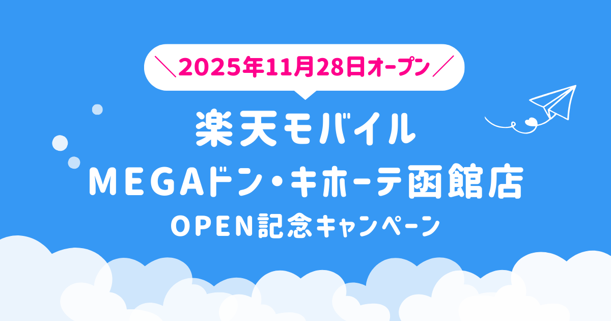 2025年11月28日(金)、北海道函館市に新たに「楽天モバイル MEGAドン・キホーテ函館店」がオープン。楽天モバイルの新規店舗では、開店から60日間限定のOPEN記念キャンペーンを実施しています。
