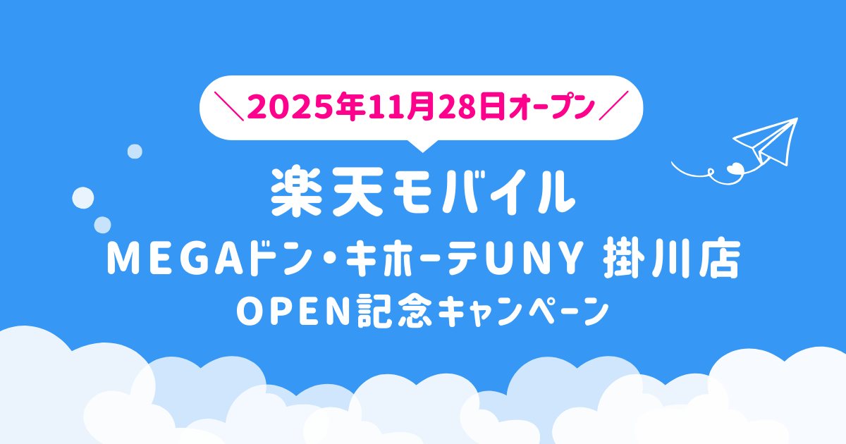 2025年11月28日(金)、静岡県掛川市に新たに「楽天モバイル MEGAドン・キホーテUNY 掛川店」がオープン。楽天モバイルの新規店舗では、開店から60日間限定のOPEN記念キャンペーンを実施しています。