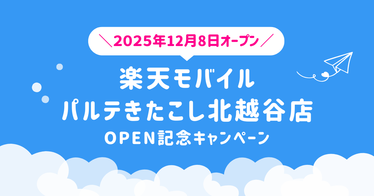 2025年12月8日(月)、埼玉県越谷市大沢に新たに「楽天モバイル パルテきたこし北越谷店」がオープン。楽天モバイルの新規店舗では、開店から60日間限定のOPEN記念キャンペーンを実施しています。