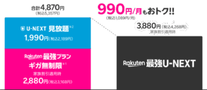 月額料金は3,880円で、楽天モバイルの通信プラン(データ無制限)とU-NEXTの見放題サービスが含まれています。通常、楽天モバイルの「Rakuten最強プラン」とU-NEXTをそれぞれ別々に契約すると合計4,870円になりますが、両方を組み合わせたRakuten最強U-NEXTをご契約することで毎月990円お得になります。