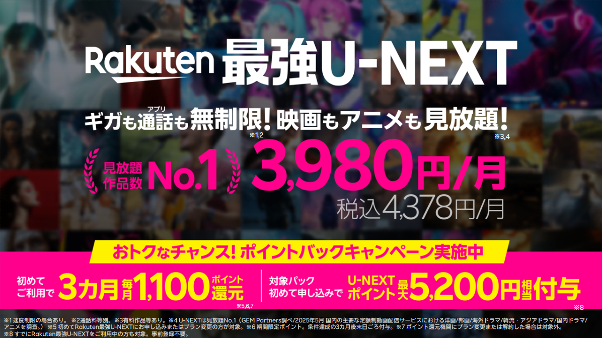 楽天モバイルと動画配信サービスのU-NEXTがタッグを組んだ新しいセットプランです。通信とエンタメを一体化したサービスとして、ギガ無制限のスマホ回線+U-NEXT 見放題 を、ひとつの月額料金で利用できます。