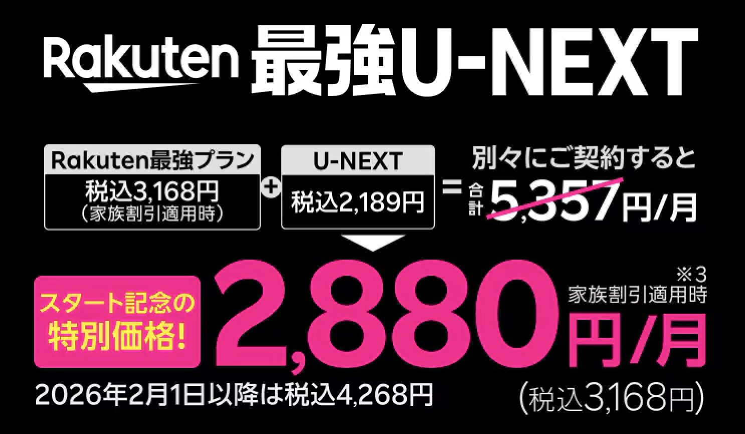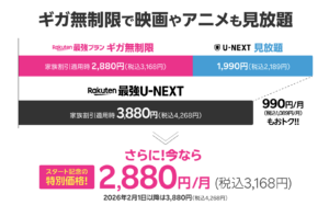 通常、楽天モバイルの「Rakuten最強プラン」とU-NEXTを別々に契約すると合計で4,870円となるため、セットにすることで1月末までは1,990円、2月以降も990円もお得になります。