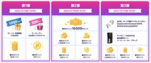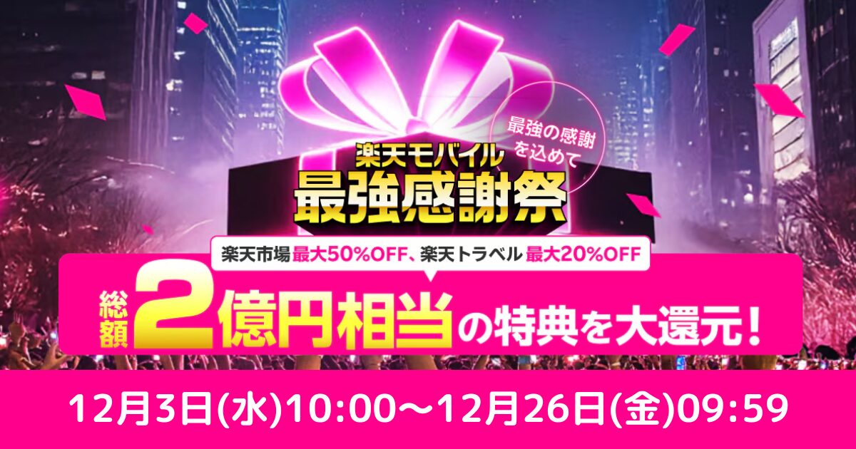楽天モバイルの「最強感謝祭」は、楽天モバイルの契約者向けに30以上の楽天サービスからポイント・クーポン、豪華賞品が登場し、還元総額はなんと2億円。開催期間は 2025年12月3日(水)10:00~12月26日(金)09:59となっています。
