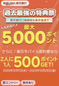 楽天銀行の口座開設で最大5,000ポイント進呈のキャンペーンなどを実施中です。家計や貯蓄を意識するユーザーにもおすすめです。