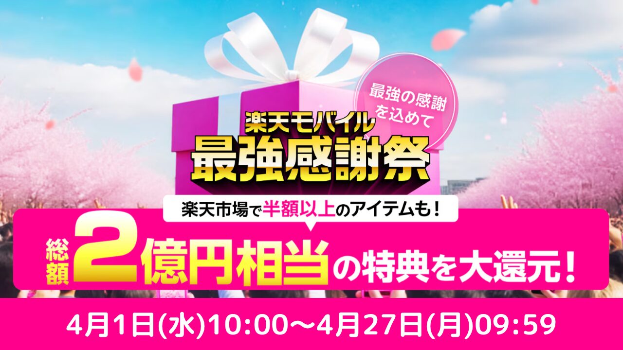 【2026年春】楽天モバイル「最強感謝祭」総額2億円相当の特典を大還元!4/1(水)10:00〜4月27日(月)09:59まで