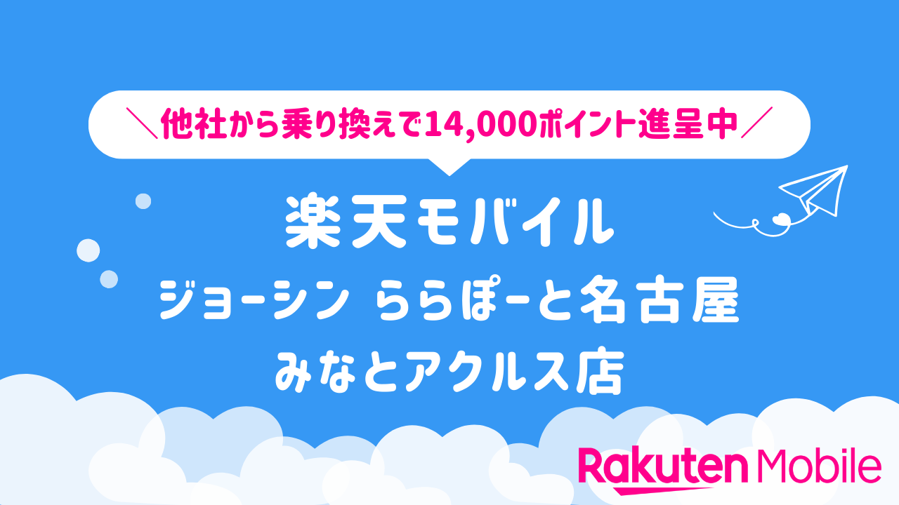 楽天モバイル ジョーシン ららぽーと名古屋みなとアクルス店の店舗情報をわかりやすく整理しています。他社から乗り換えで14,000ポイントをゲットできるキャンペーンや、店舗限定で利用できる特典などの情報も合わせてご紹介いたします。