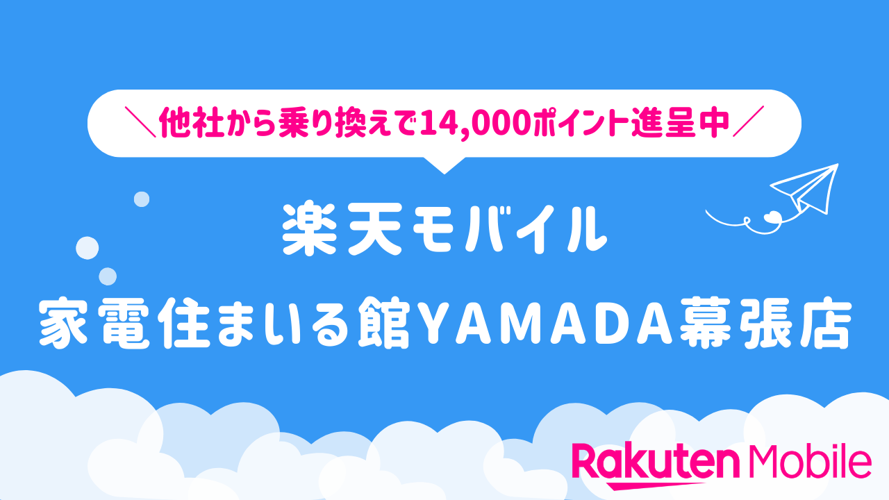 楽天モバイル 家電住まいる館YAMADA幕張店の店舗情報をわかりやすく整理しています。他社から乗り換えで14,000ポイントをゲットできるキャンペーンや、店舗限定で利用できる特典などの情報も合わせてご紹介いたします。