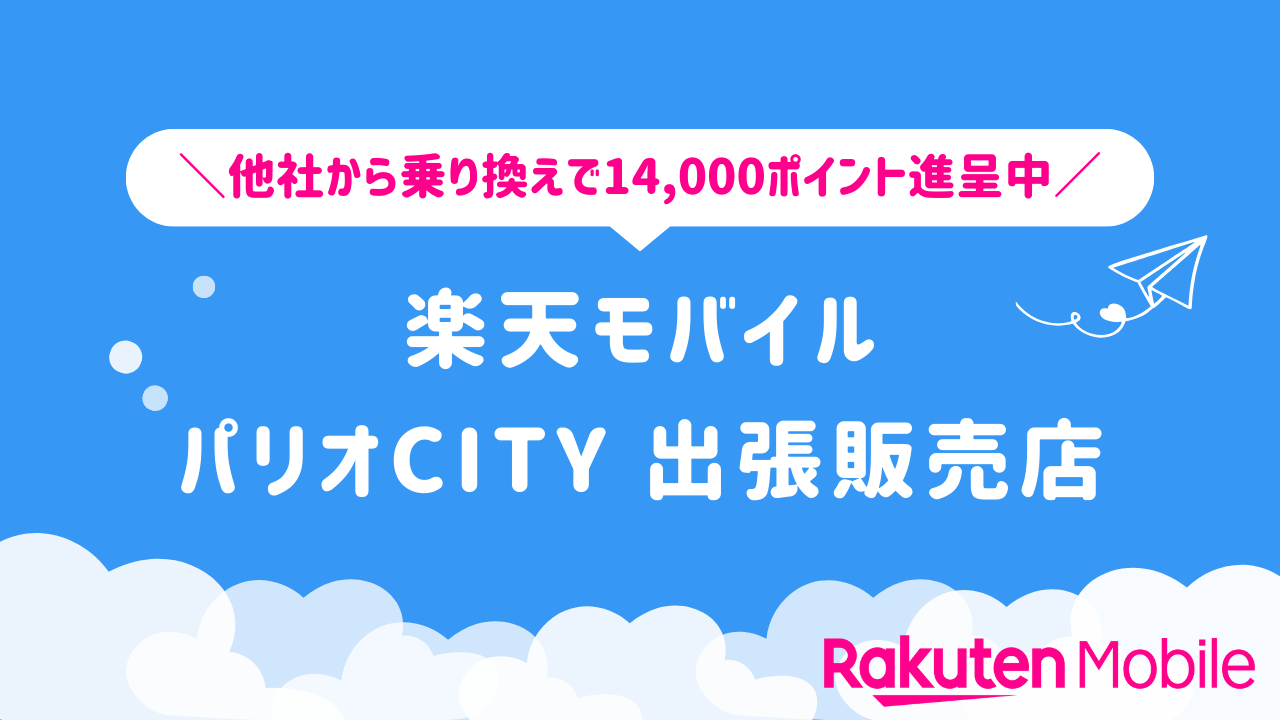 楽天モバイル パリオCiTY 出張販売店の店舗情報をわかりやすく整理しています。他社から乗り換えで14,000ポイントをゲットできるキャンペーンや、店舗限定で利用できる特典などの情報も合わせてご紹介いたします。