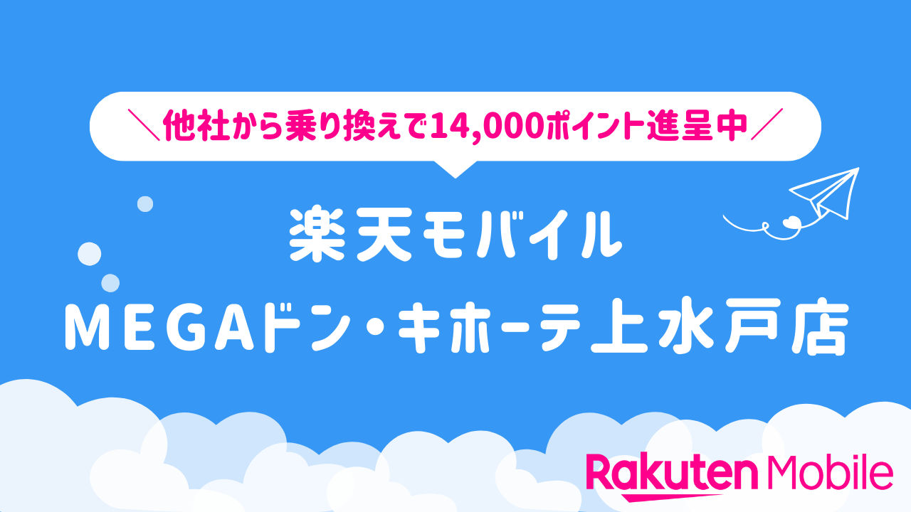 楽天モバイル MEGAドン・キホーテ上水戸店の店舗情報をわかりやすく整理しています。他社から乗り換えで14,000ポイントをゲットできるキャンペーンや、店舗限定で利用できる特典などの情報も合わせてご紹介いたします。