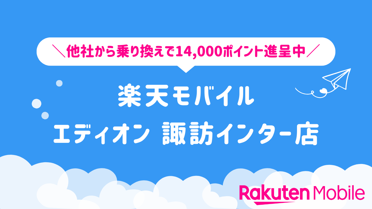 楽天モバイル エディオン 諏訪インター店の店舗情報をわかりやすく整理しています。他社から乗り換えで14,000ポイントをゲットできるキャンペーンや、店舗限定で利用できる特典などの情報も合わせてご紹介いたします。