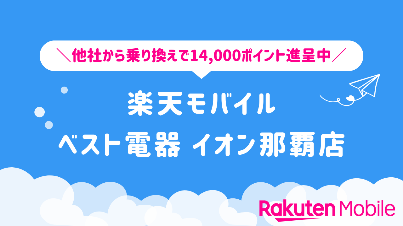 楽天モバイル ベスト電器 イオン那覇店の店舗情報をわかりやすく整理しています。他社から乗り換えで14,000ポイントをゲットできるキャンペーンや、店舗限定で利用できる特典などの情報も合わせてご紹介いたします。