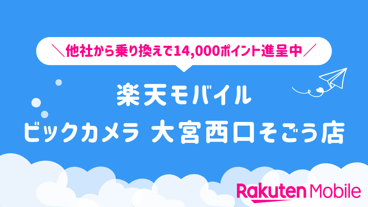 楽天モバイル ビックカメラ 大宮西口そごう店の店舗情報をわかりやすく整理しています。他社から乗り換えで14,000ポイントをゲットできるキャンペーンや、店舗限定で利用できる特典などの情報も合わせてご紹介いたします。