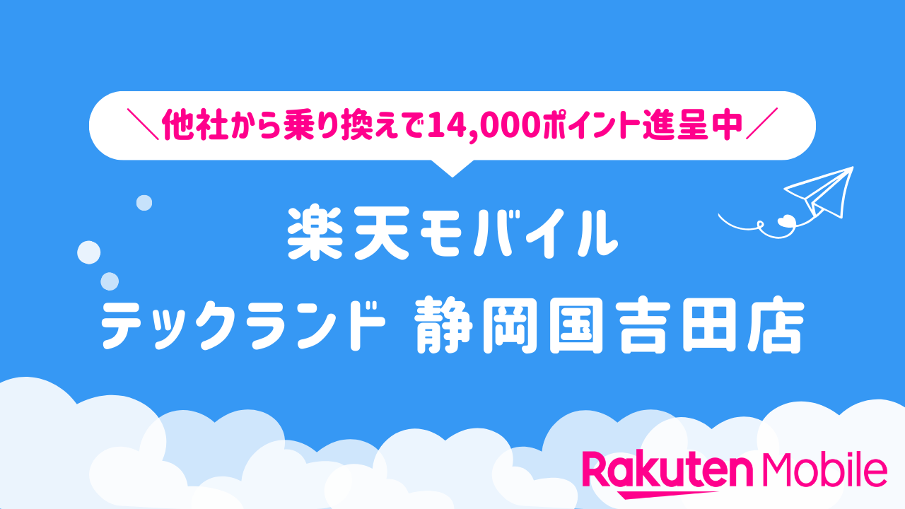 楽天モバイル テックランド 静岡国吉田店の店舗情報をわかりやすく整理しています。他社から乗り換えで14,000ポイントをゲットできるキャンペーンや、店舗限定で利用できる特典などの情報も合わせてご紹介いたします。