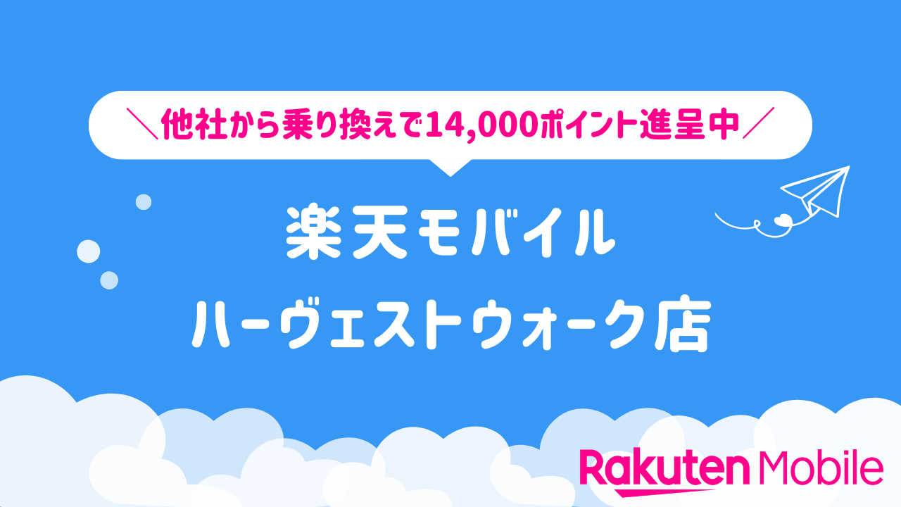 楽天モバイル ハーヴェストウォーク店の店舗情報をわかりやすく整理しています。他社から乗り換えで14,000ポイントをゲットできるキャンペーンや、店舗限定で利用できる特典などの情報も合わせてご紹介いたします。