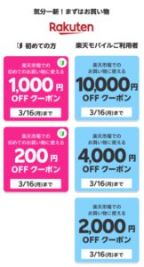 特に楽天市場の1万円OFFクーポンやトラベルの24%OFFは、枚数上限に達し次第終了してしまいます。キャンペーン期間は3月16日までですが、人気クーポンは数日でなくなる可能性が高いです。